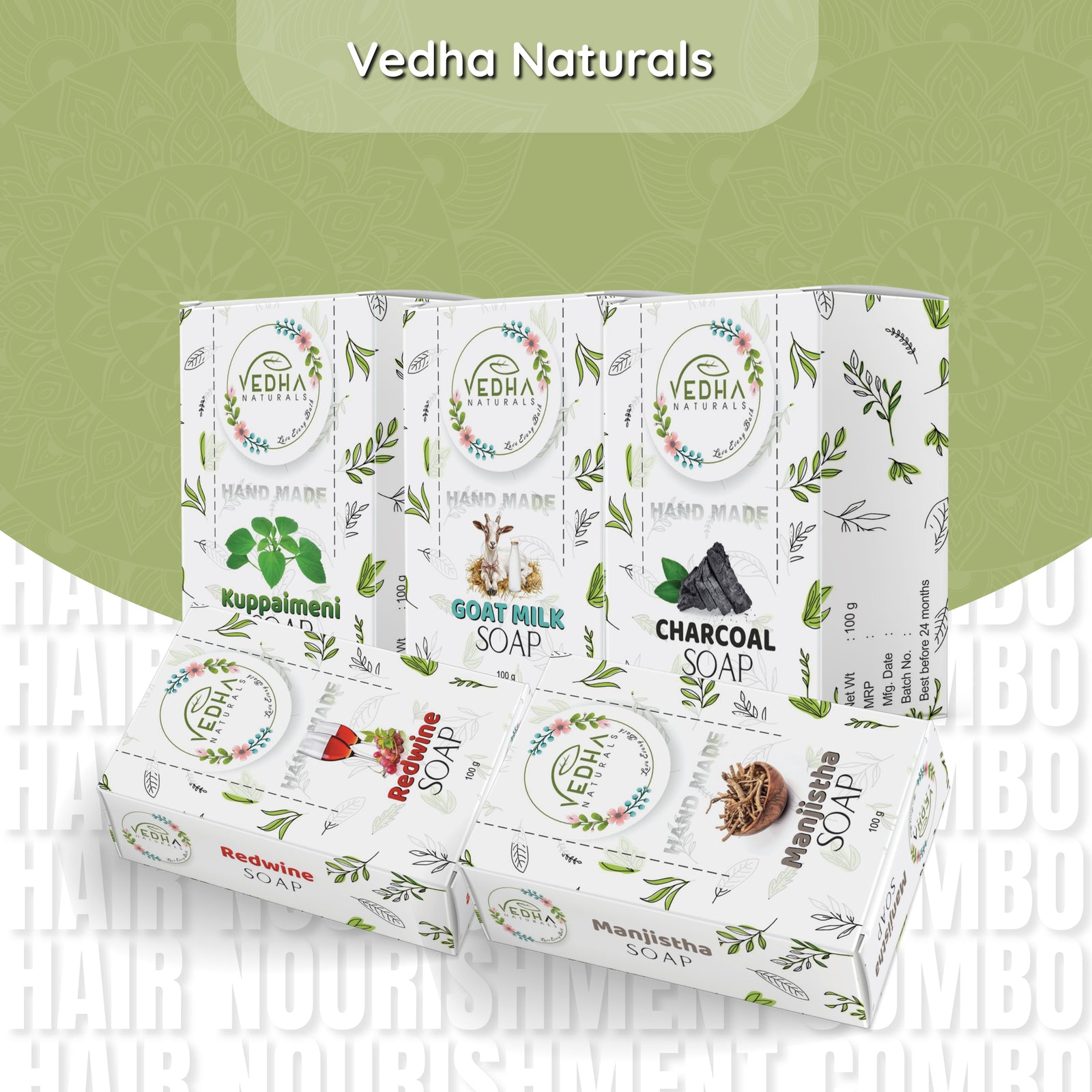 Vedha Naturals offers a variety of Cold Process (CP) soaps, each with unique skin benefits. The Red Wine CP Soap is packed with antioxidants, reducing signs of aging and promoting firm, glowing skin. Charcoal CP Soap deeply cleanses and detoxifies, removing impurities and controlling acne while balancing oil production. Goat Milk CP Soap is a nourishing, hydrating soap that soothes dry and sensitive skin, leaving it soft and smooth. Kuppaimeni CP Soap helps with acne treatment, inflammation, and skin healing, while also improving overall skin health. Manjistha CP Soap brightens skin, evens out tone, and reduces dark spots, while providing anti-inflammatory benefits. All soaps are crafted with natural ingredients to promote healthier, clearer, and radiant skin.